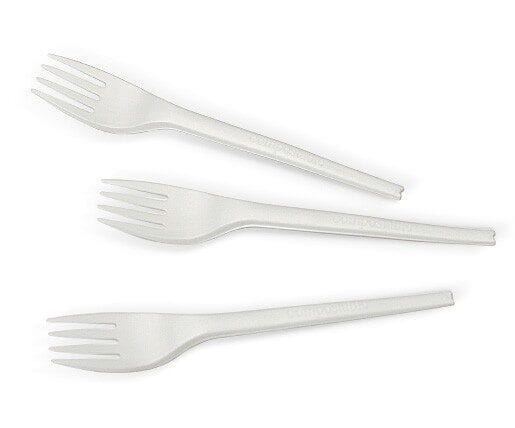 - Compostable heat resistant cutlery, made from PLA derived from corn starch. \n